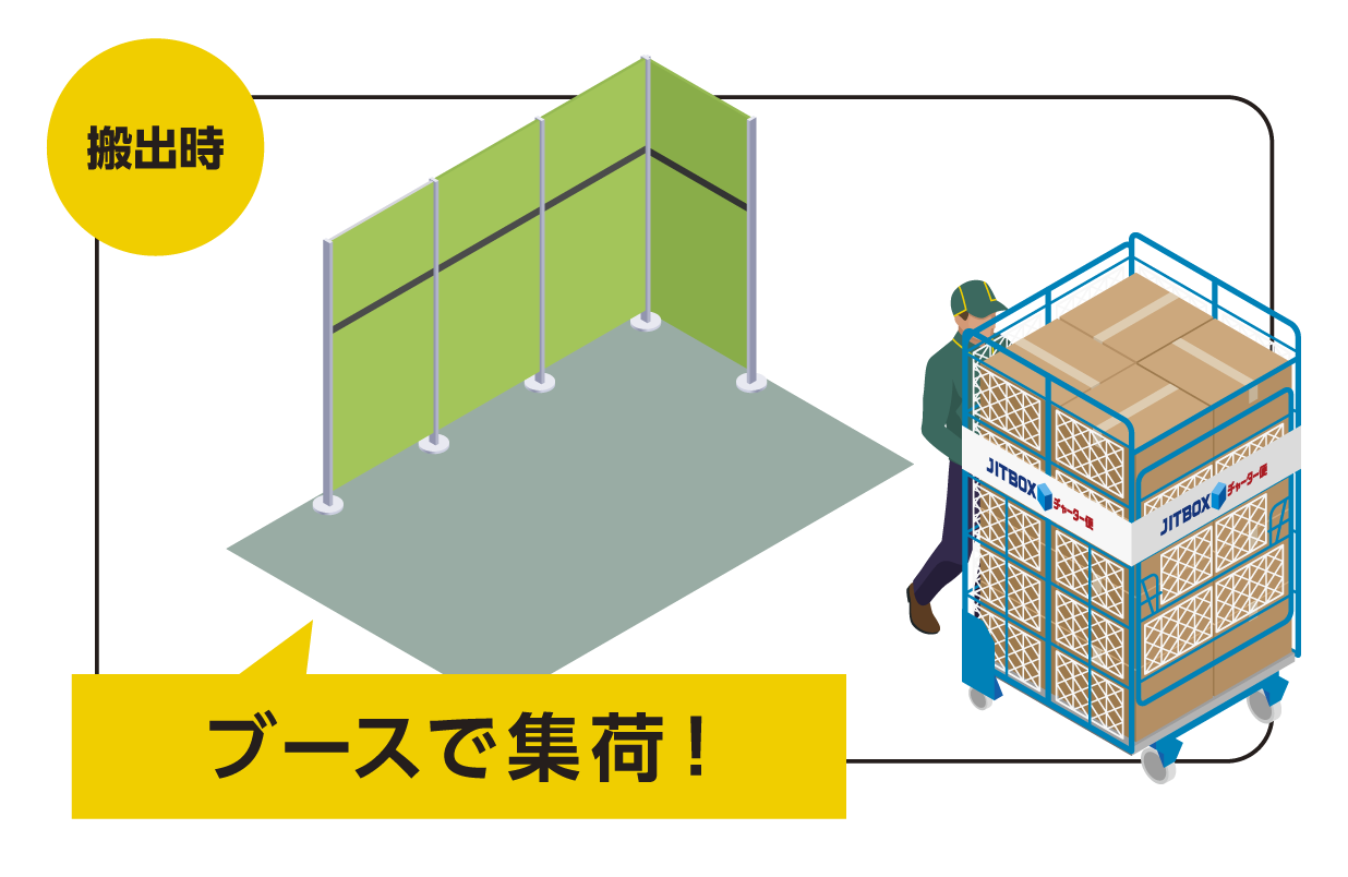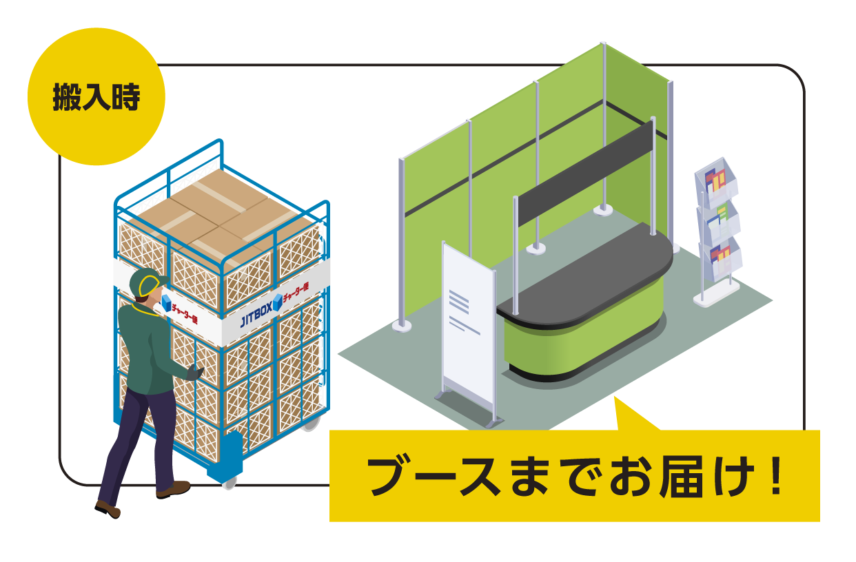 JITBOXチャーター便はお預けいただいたままの状態でブースにお届け